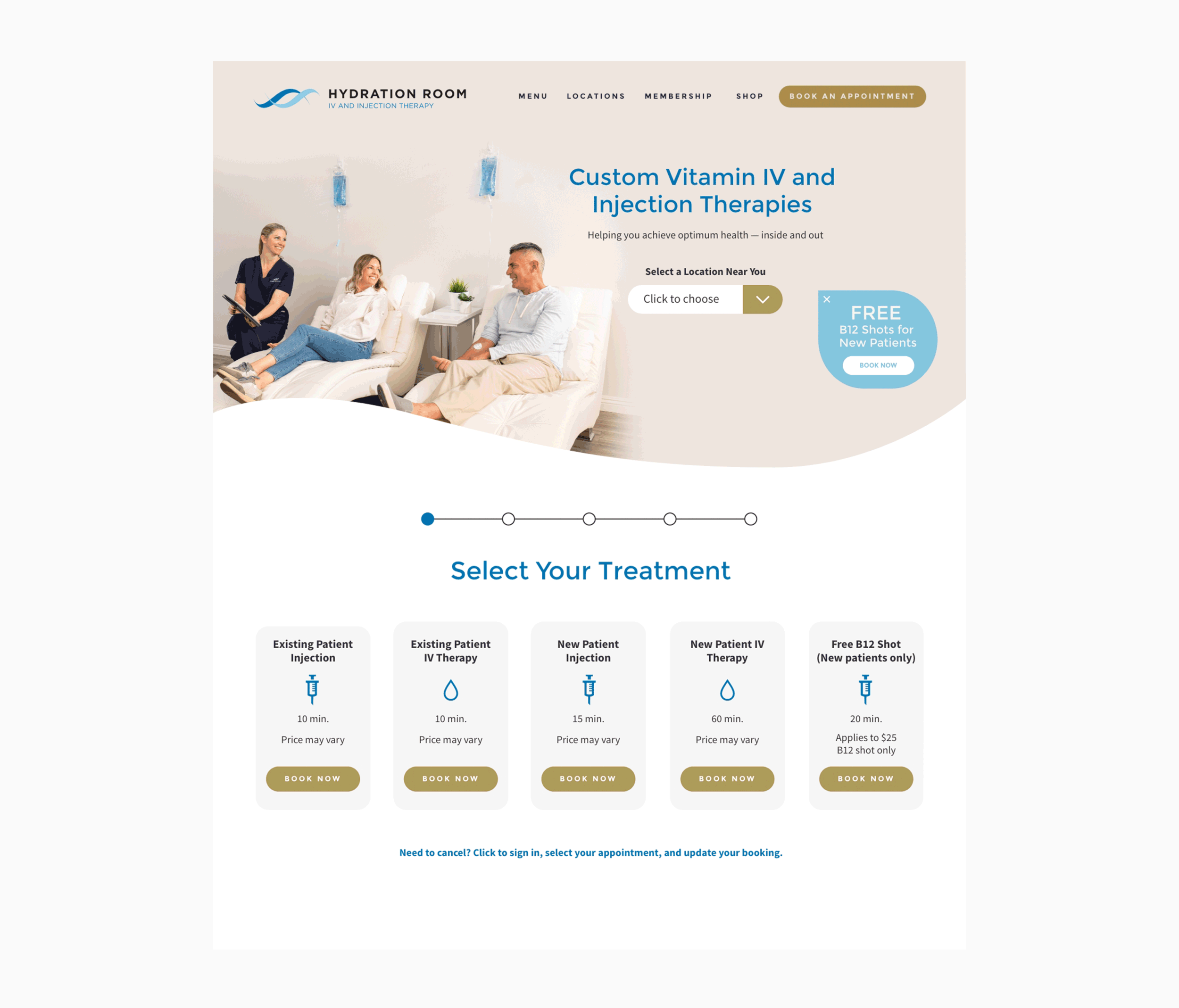 The challenge was to update the site’s layout and to simplify the booking experience. I accomplished this by breaking down what each therapy included in a way that was easy for the user to compare the benefits of each.